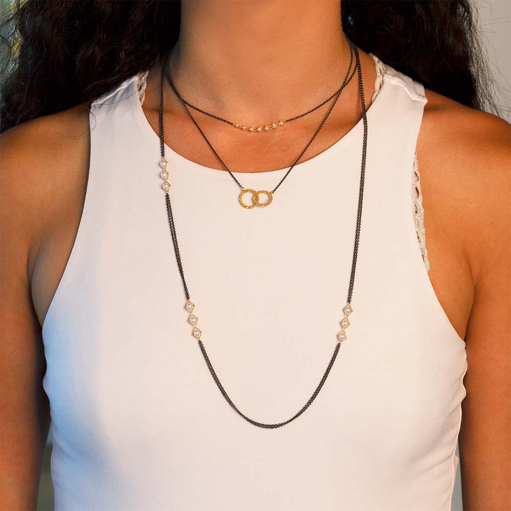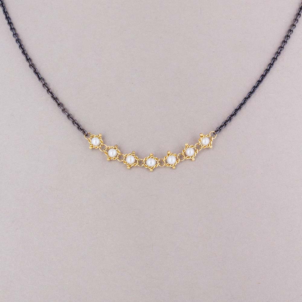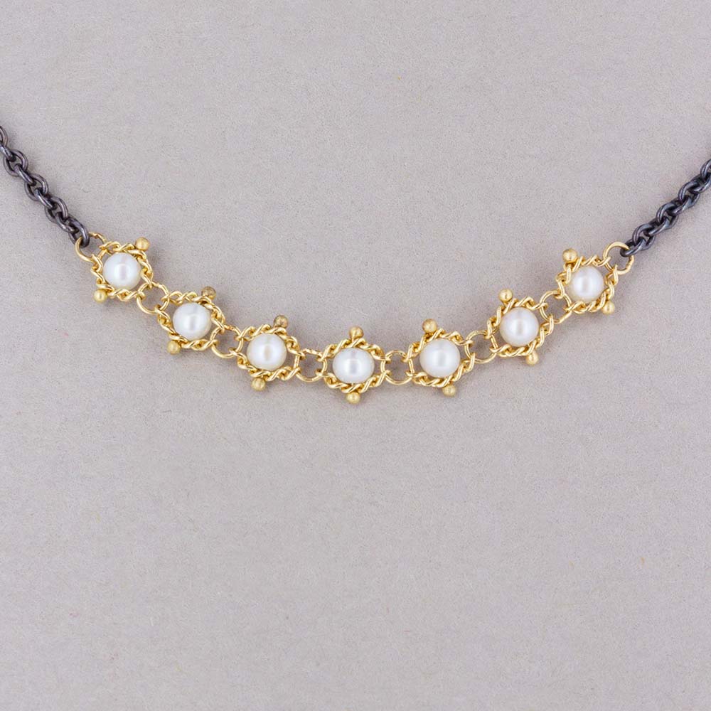 Oxidized sterling silver and 18k yellow gold layering necklace with cultured freshwater pearls