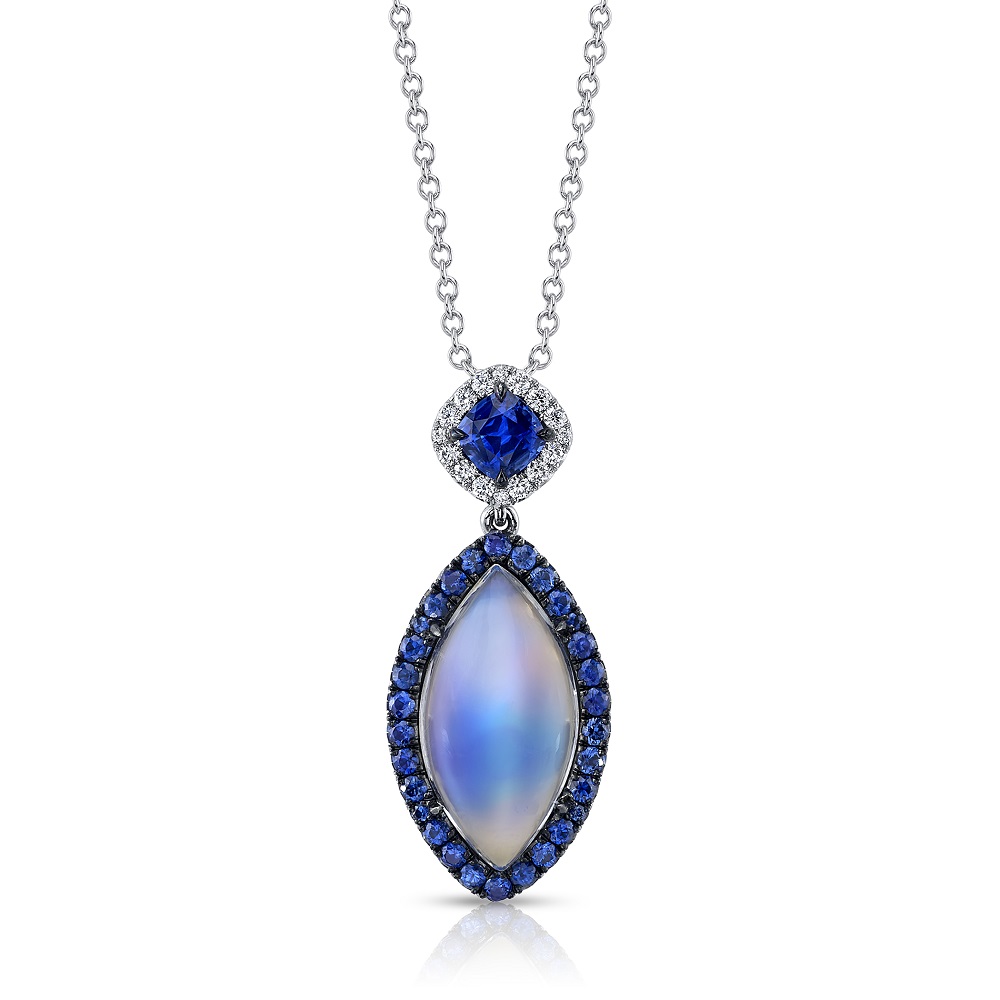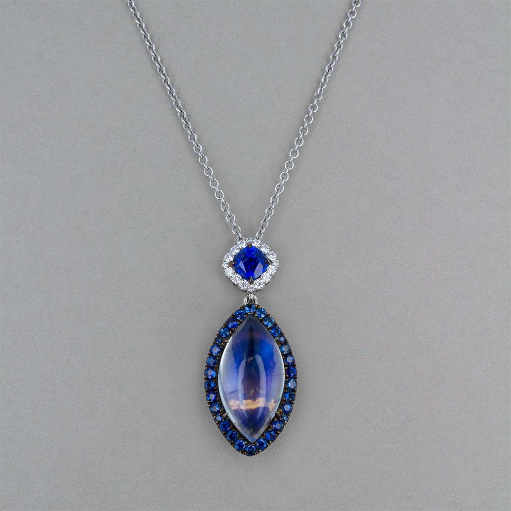 This captivating pendant by Omi Prive features a marquise shaped moonstone, its mystical glow enhanced by a stunning halo of blue sapphires and accented above with sparkling diamonds.  Set in platinum, it radiates otherworldly beauty that brings a touch of magic and elegance to any occasion.