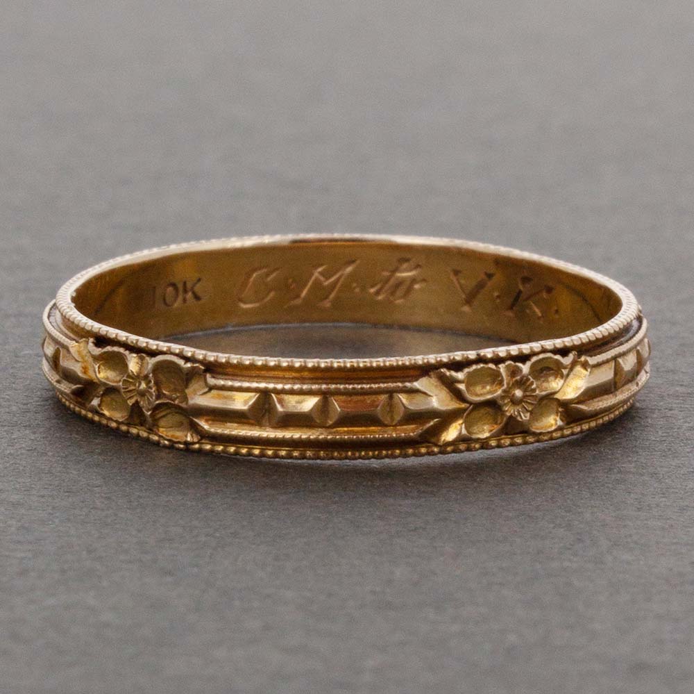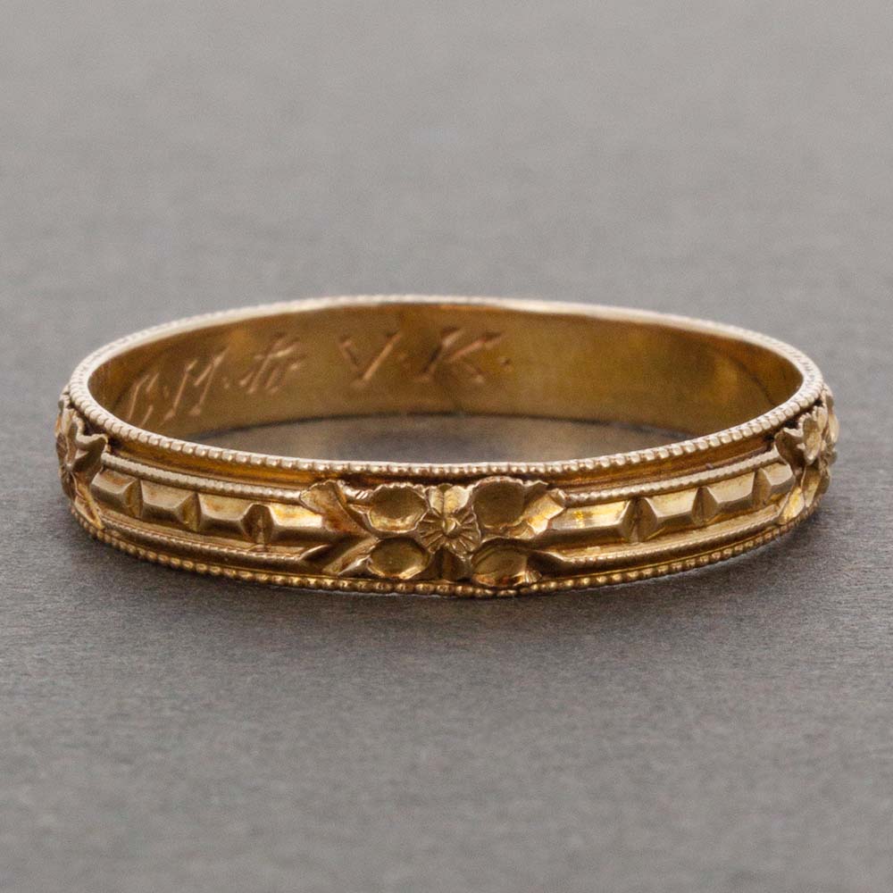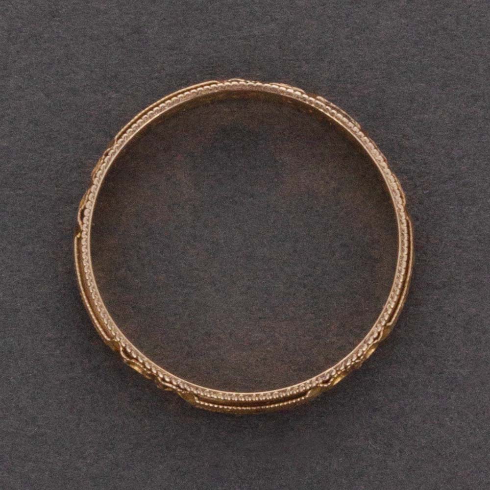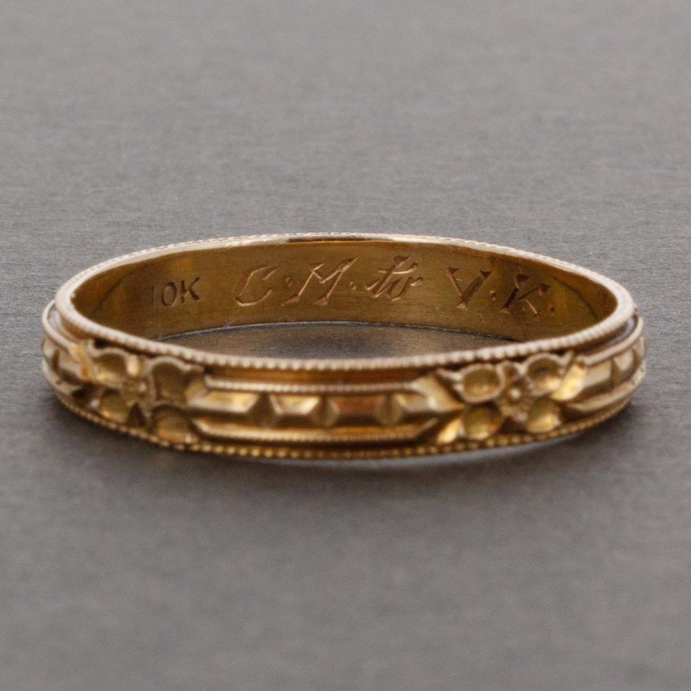 This vintage wedding ring is so cool. A beautiful pattern surrounds this yellow gold, hard to find treasure.