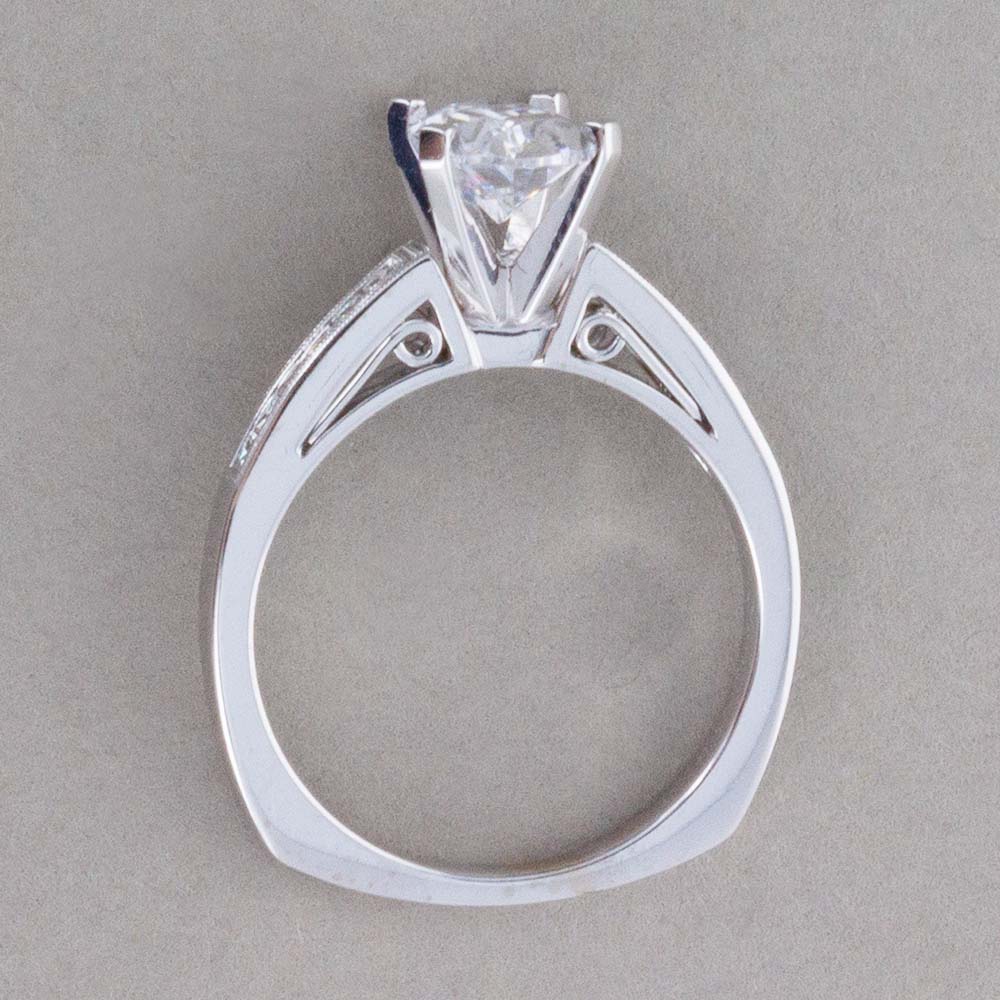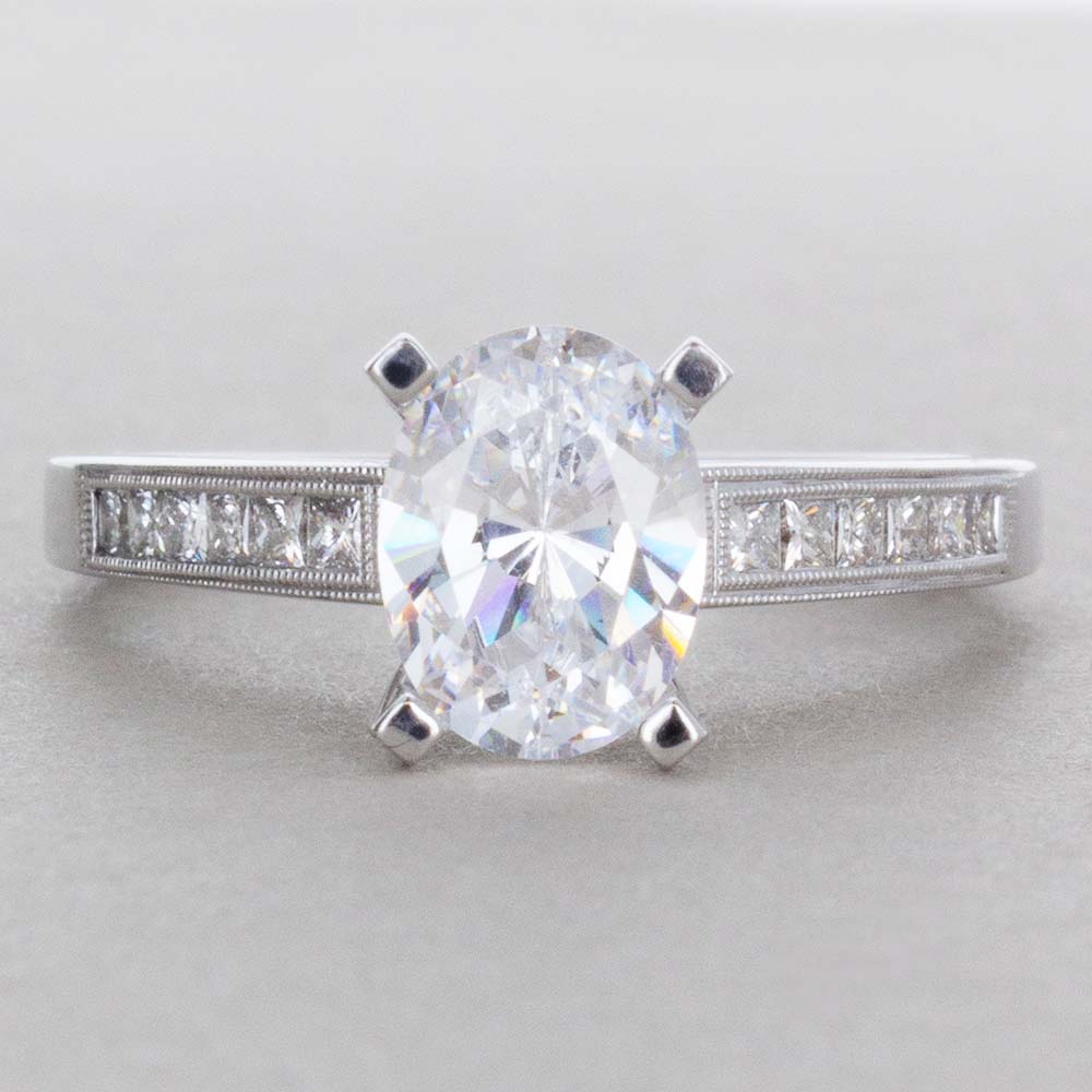 - Ring is shown with 1.5 carat oval cz center. The prongs can be replaced to fit any size or shape center.