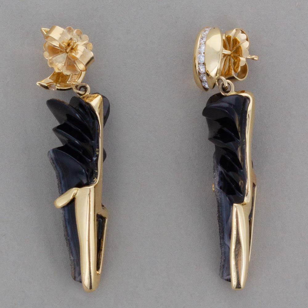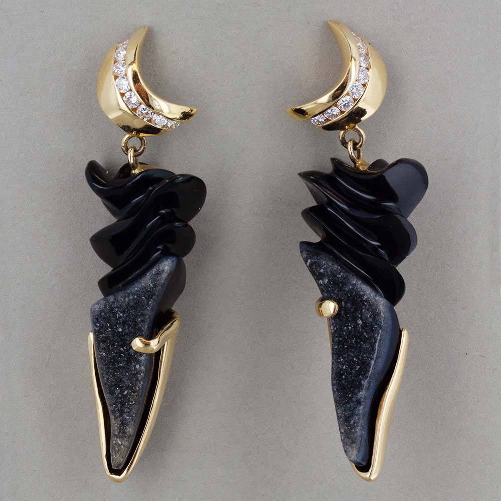 Yellow Gold Steve Quick Original Drop Earrings With 2 Carved Black Druzy Quartz And 16 Round Diamonds, On Posts With Friction Backs