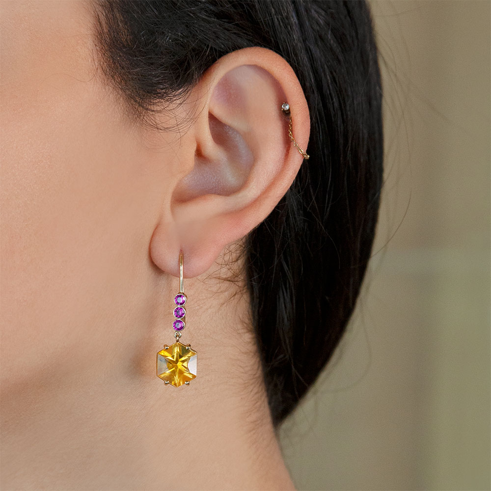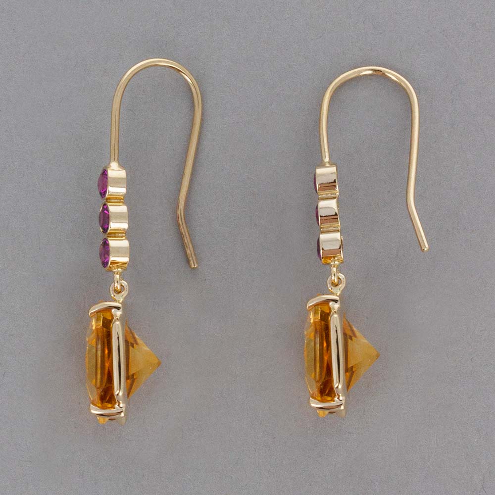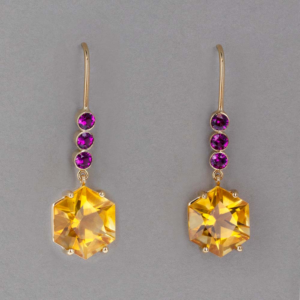 STEVE QUICK ORIGINAL HANDMADE 14K YELLOW GOLD DROP EARRINGS SET WITH 2 HEXAGON CITRINES WEIGHING 8.83 CARATS TOTAL AND 6 ROUND GRAPE GARNETS, ON SHEPHERD HOOKS