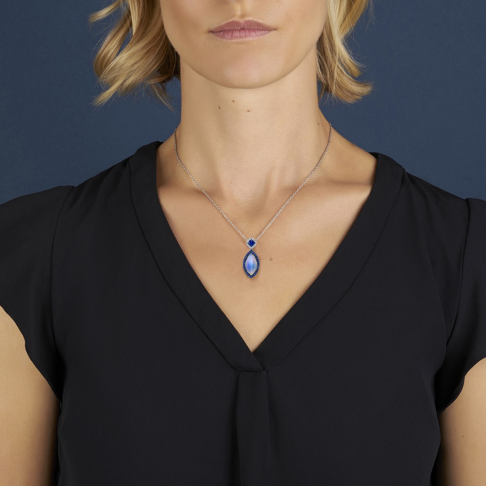This captivating pendant by Omi Prive features a marquise shaped moonstone, its mystical glow enhanced by a stunning halo of blue sapphires and accented above with sparkling diamonds.  Set in platinum, it radiates otherworldly beauty that brings a touch of magic and elegance to any occasion.